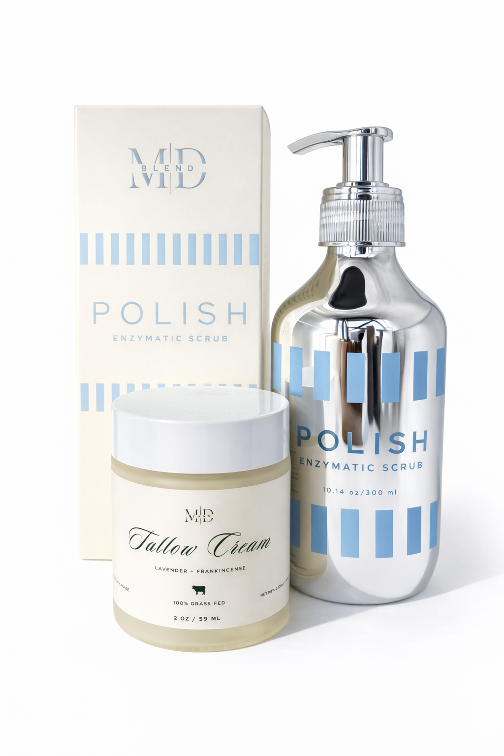 The Buff + Balm Bundle pairs POLISH (Formerly PRIME FIX) with M.D. Blend Tallow Cream – Lavender + Frankincense for the ultimate exfoliate-and-replenish ritual. Think polished first, then plush.