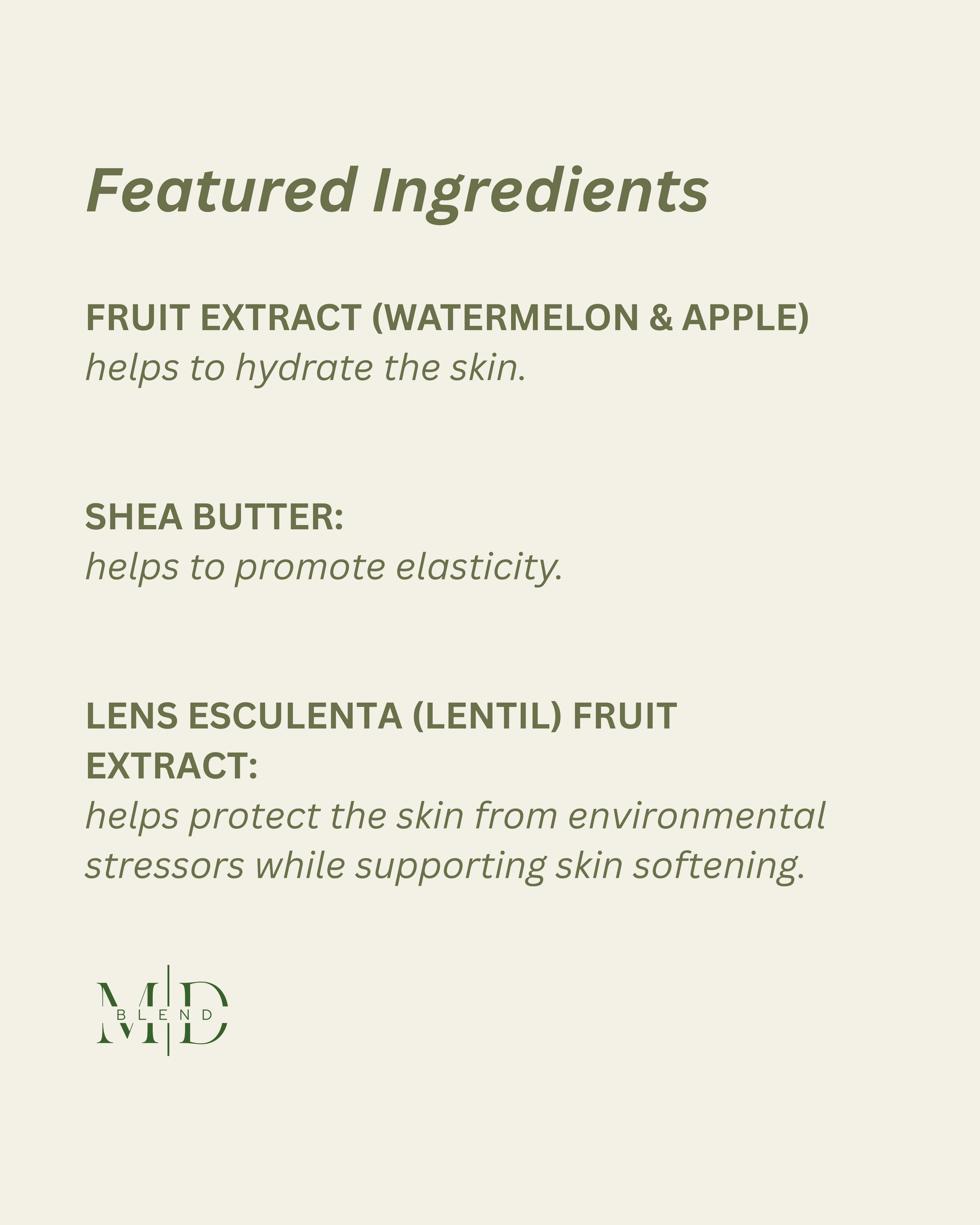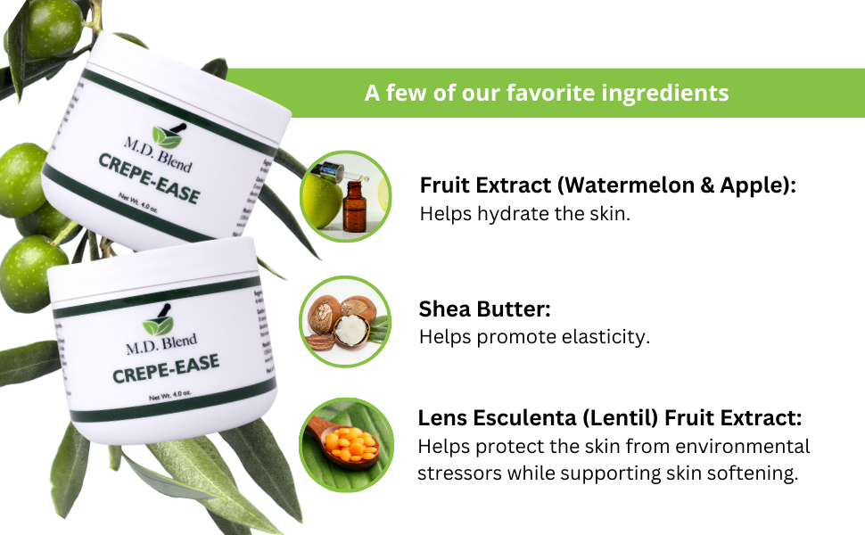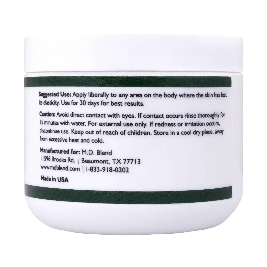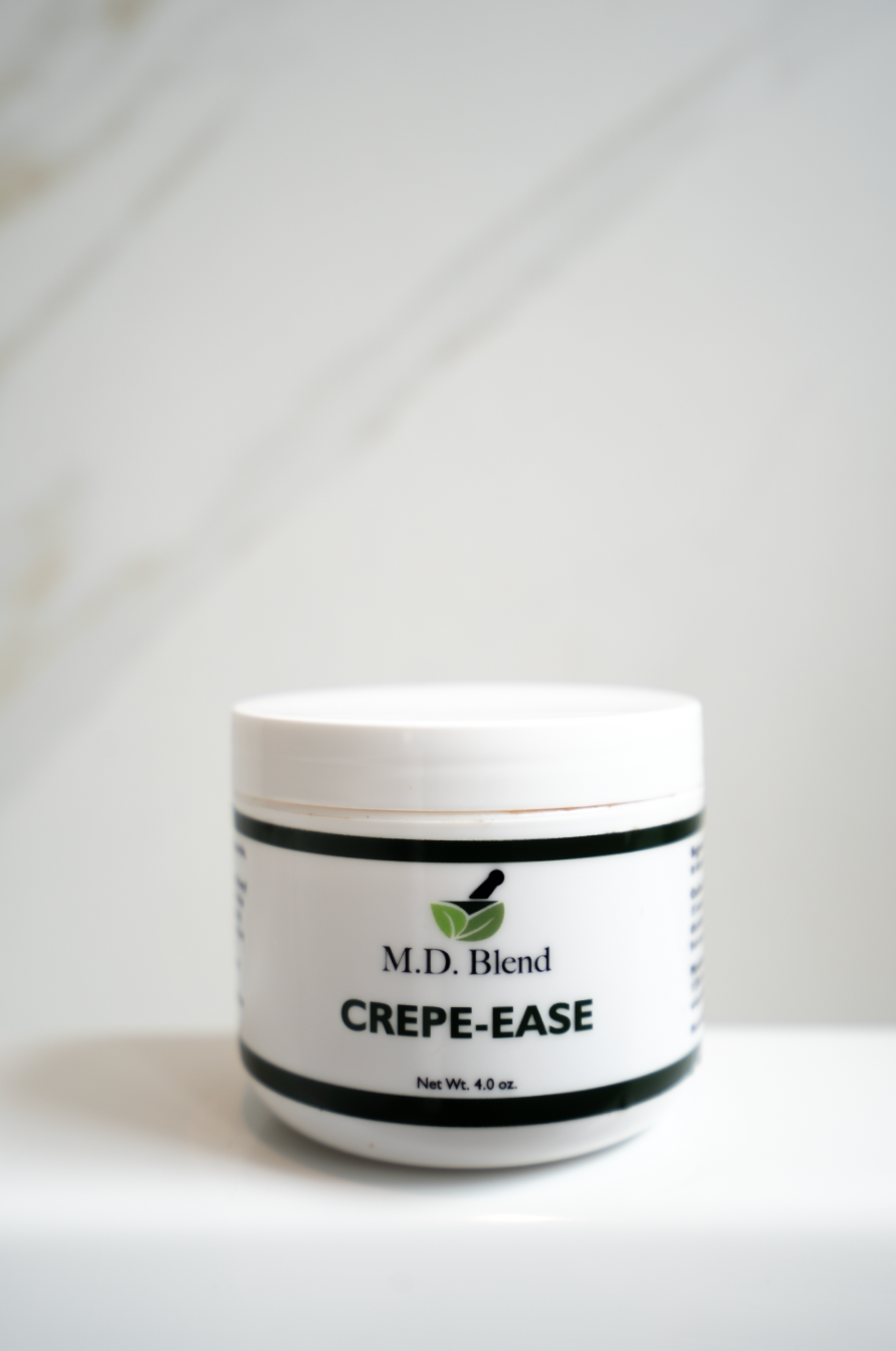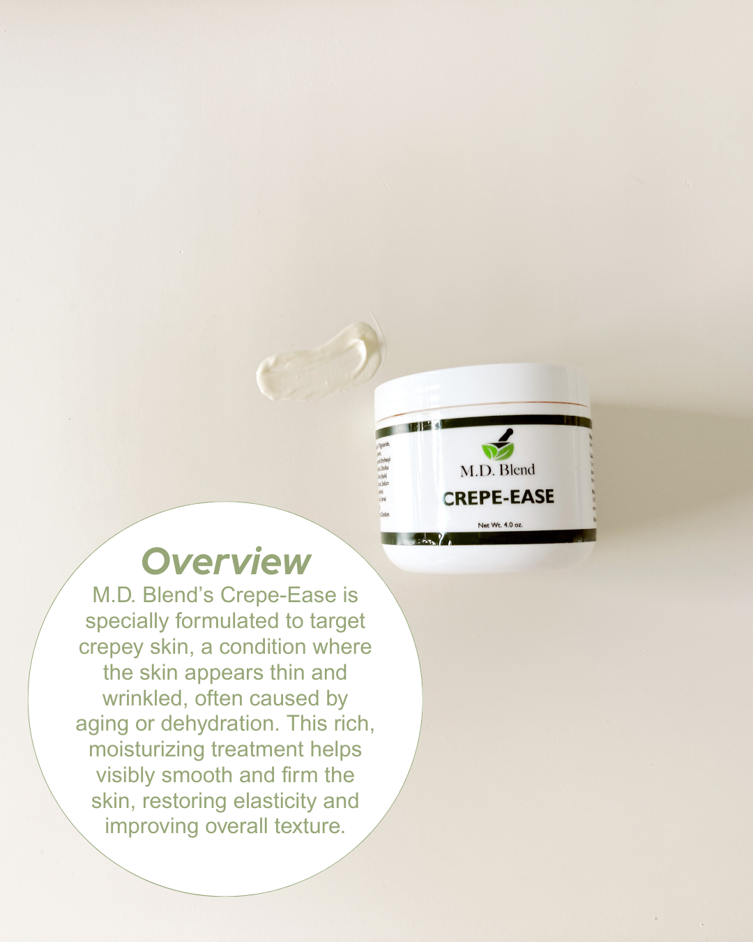 M.D. Blend’s Crepe-Ease is specially formulated to target crepey skin, a condition where the skin appears thin and wrinkled, often caused by aging or dehydration. This rich, moisturizing treatment helps visibly smooth and firm the skin, restoring elasticity and improving overall texture. With nourishing ingredients, Crepe-Ease provides a lasting solution to rejuvenate and hydrate areas prone to crepey skin, such as the arms, neck, and legs.
