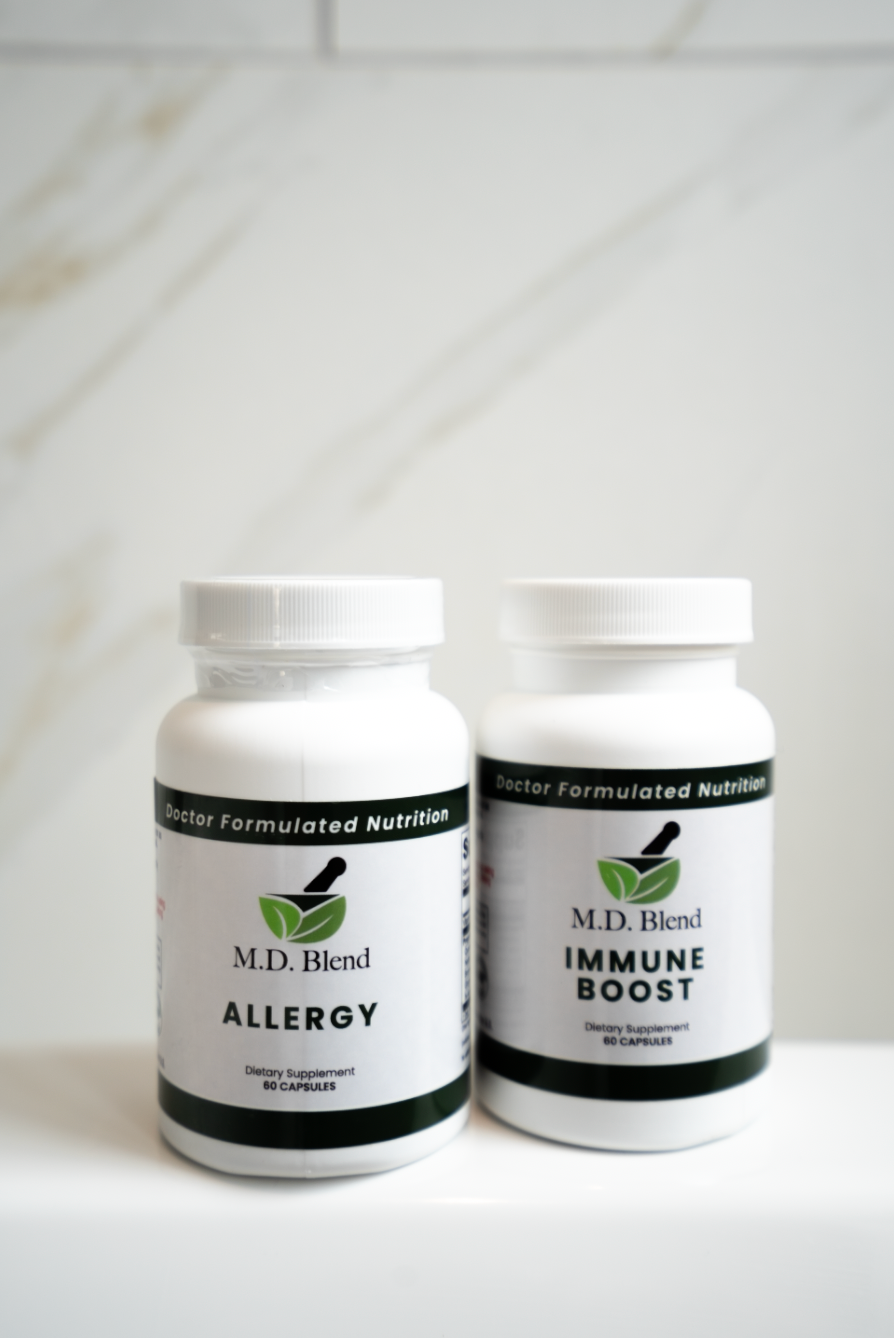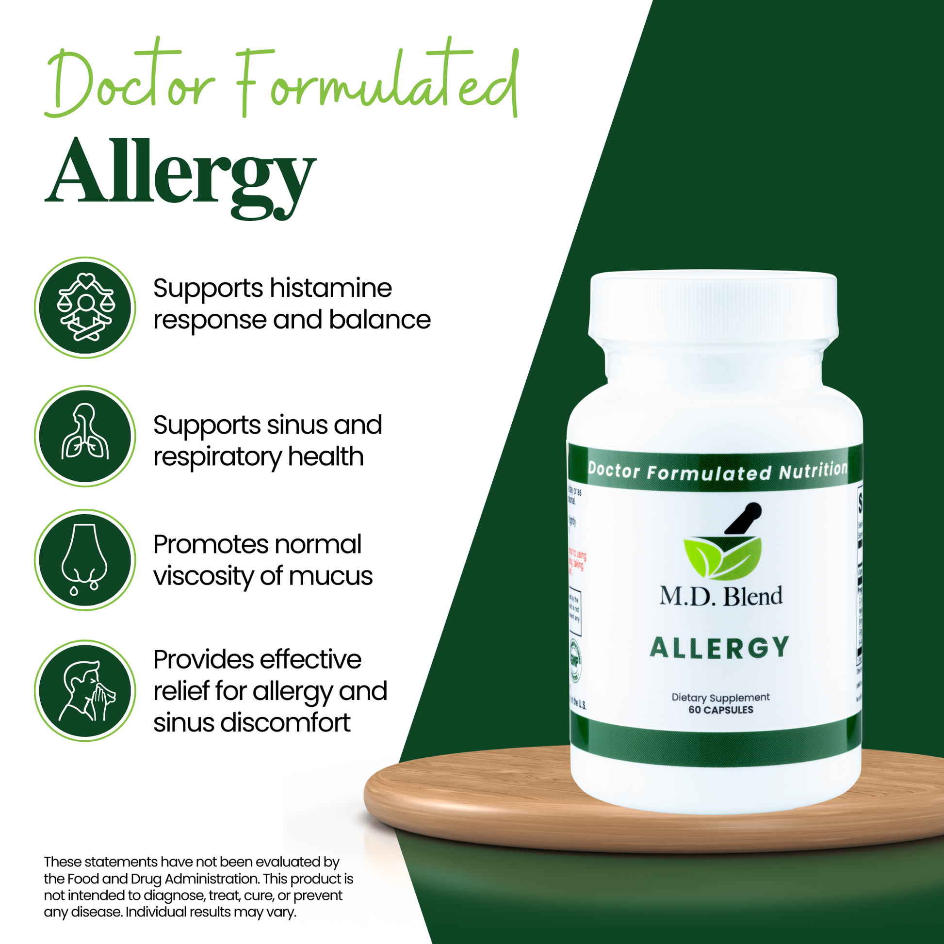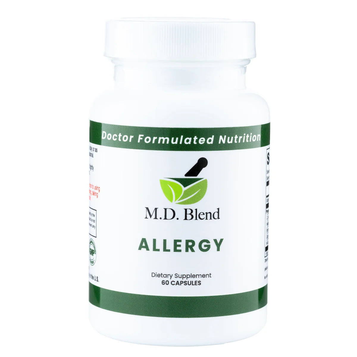 M.D. Blend's Allergy is the natural approach to histamine challenges. Allergy is a targeted blend of flavonoids, antioxidants, proteolytic enzymes and botanicals designed to provide comprehensive support for histamine challenges. Allergy promotes the stabilization of mast cells, thereby, helping to diminish the release of histamine, the main cause of the hypersensitivity reaction and helps to promote immune system balance, specifically in the mucosa.
