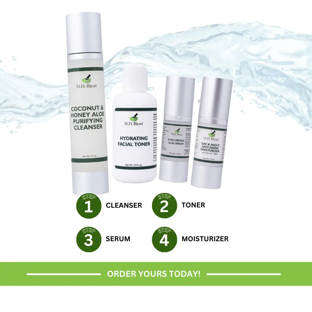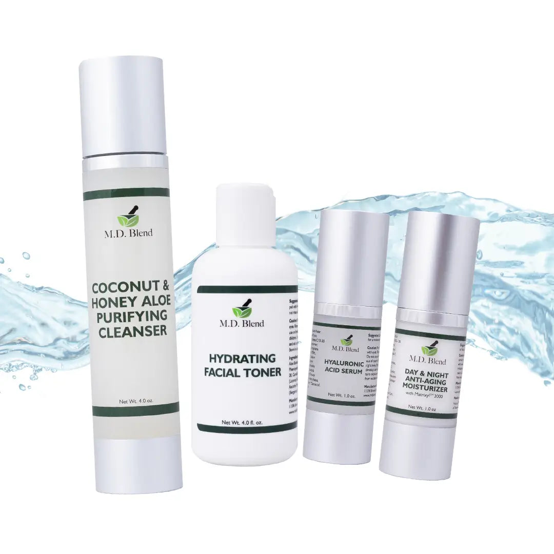 With a balanced regimen using the Coconut & Honey Aloe Purifying Cleanser, Hydrating Facial Toner, Hyaluronic Acid Serum, and Day & Night Anti-Aging Moisturizer with Matrixyl 3000, this four-step process supports skin hydration, firmness, and resilience.