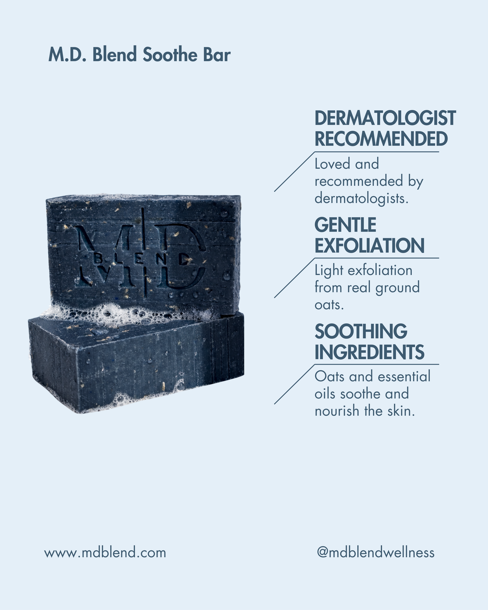 Soothe your skin with the comforting blend our favorite ingredients. Our M.D. Blend Soothe Bar is crafted with oats, coconut, and clove to lightly exfoliate while keeping your skin soft and hydrated.