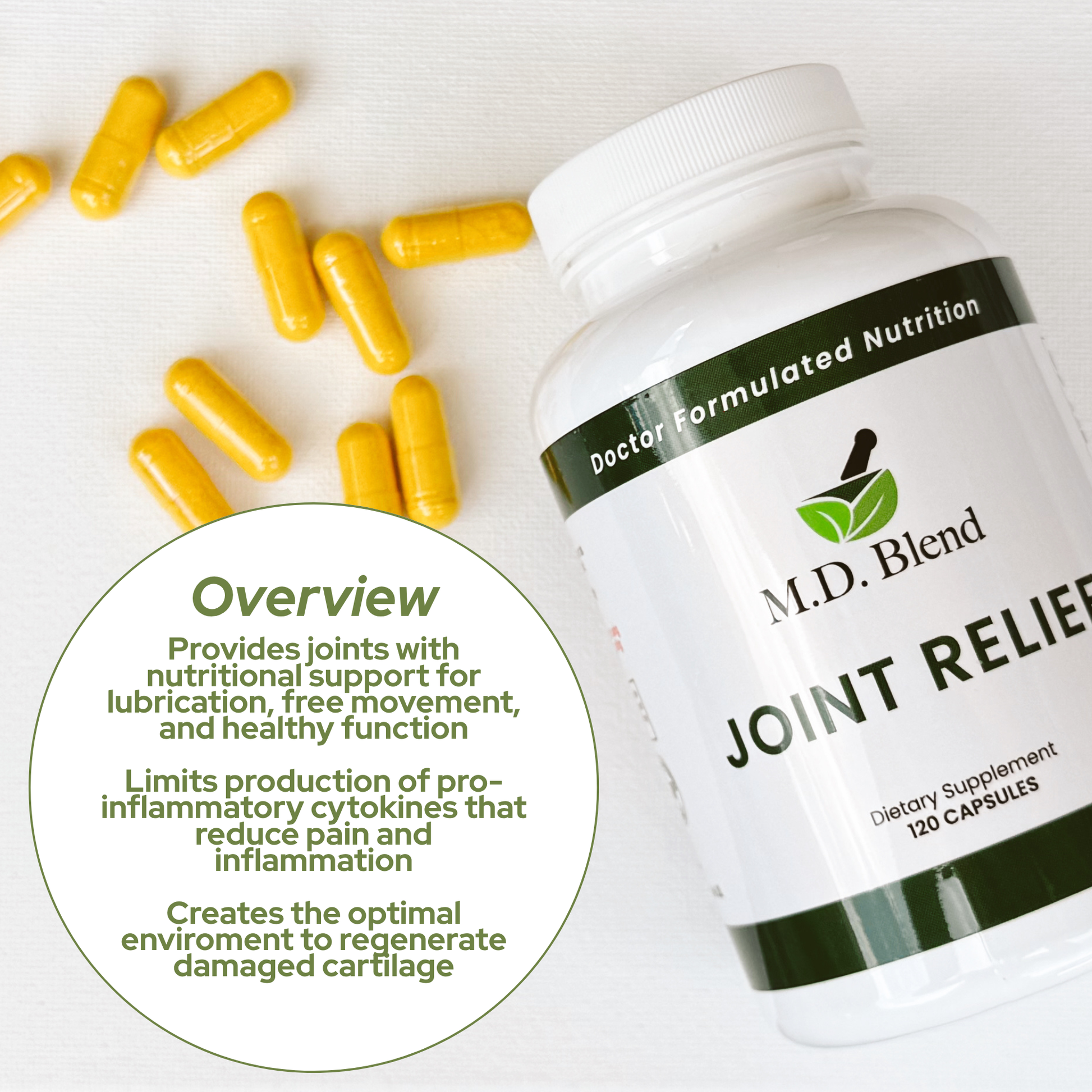 M.D. Blend's Joint Relief not only provides relief but also helps promote cartilage health for improved range of motion and better quality of life. With M.D. Blend's potent combination of nutrients, you can rest easy knowing you’re getting the best possible doctor formulated nutritional supplement for your joint pain.