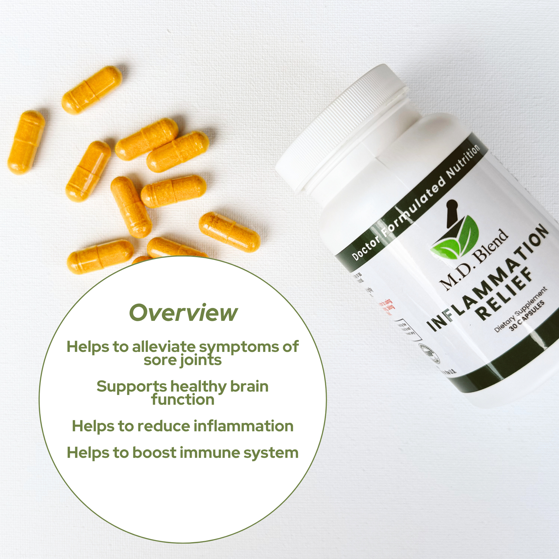 The formula utilized in M.D. Blend's Inflammation Relief was created by physicians to help maximize the effectiveness and to help provide relief so you can take charge of your health today and start feeling better with this effective blend!