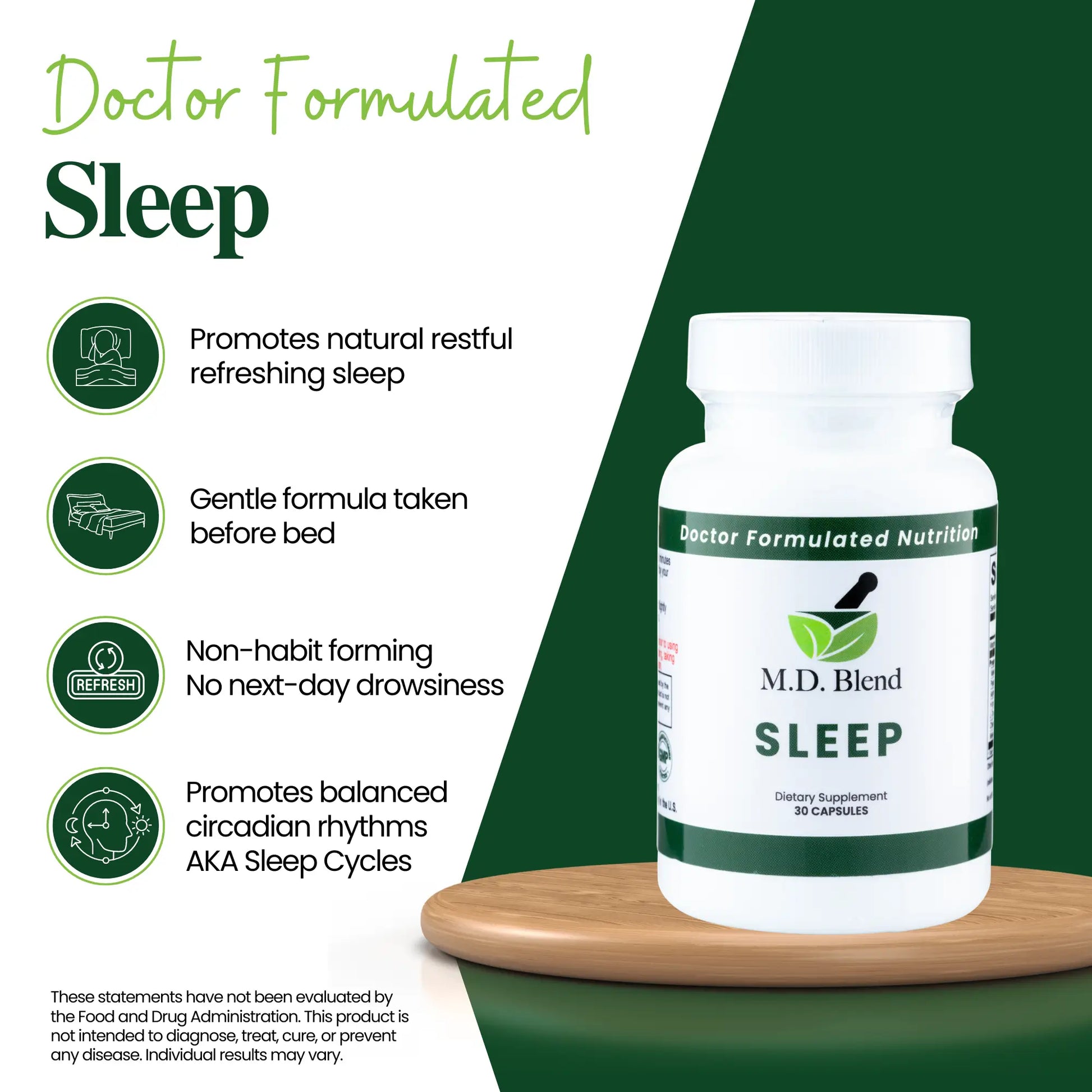 M.D. Blend’s Sleep is a carefully crafted blend of magnesium, amino acids, adaptogens, and melatonin designed to support your body’s natural sleep cycle. This calming formula helps promote relaxation, a balanced mood, and overall nighttime wellness, making it easier to unwind and feel refreshed in the morning.