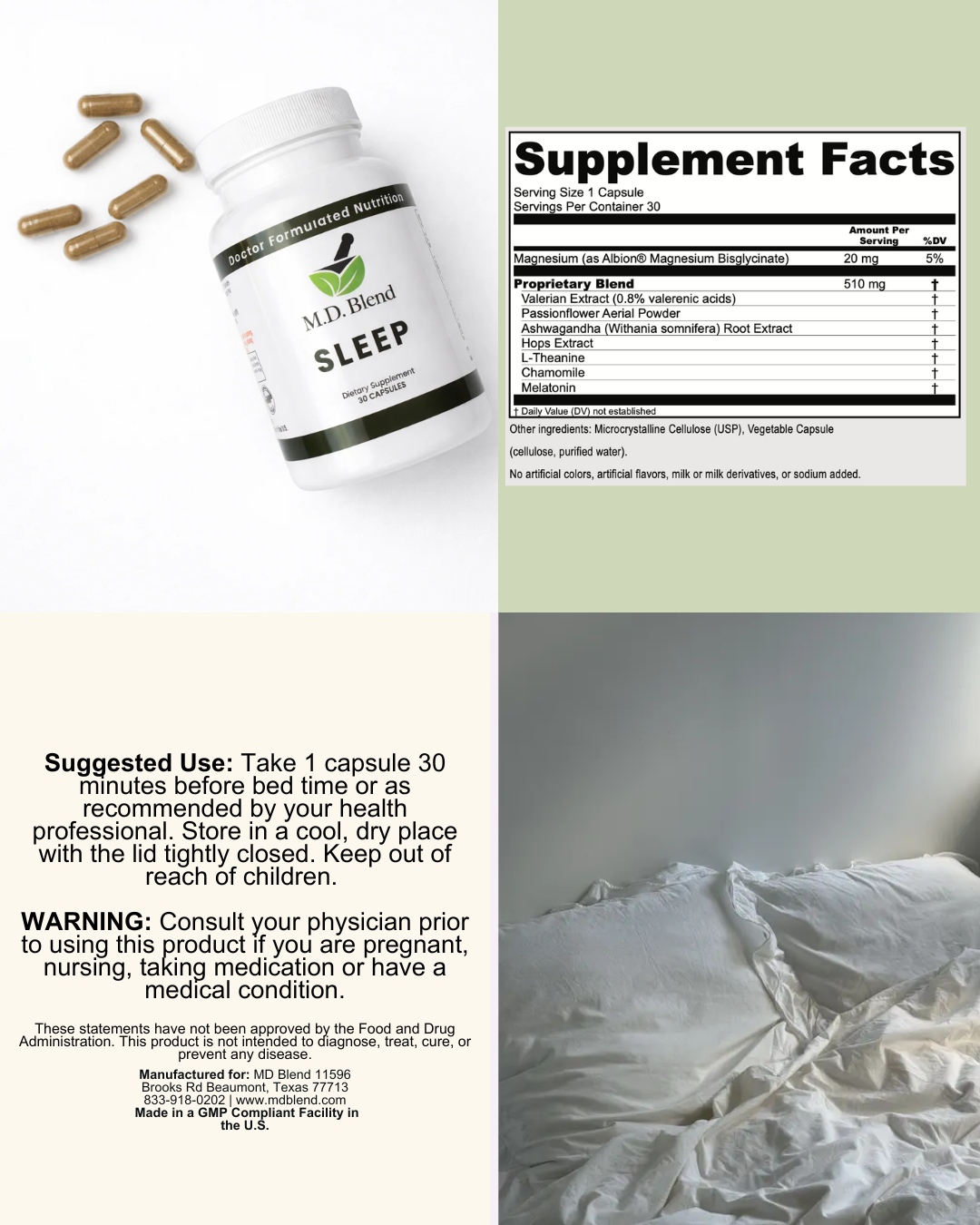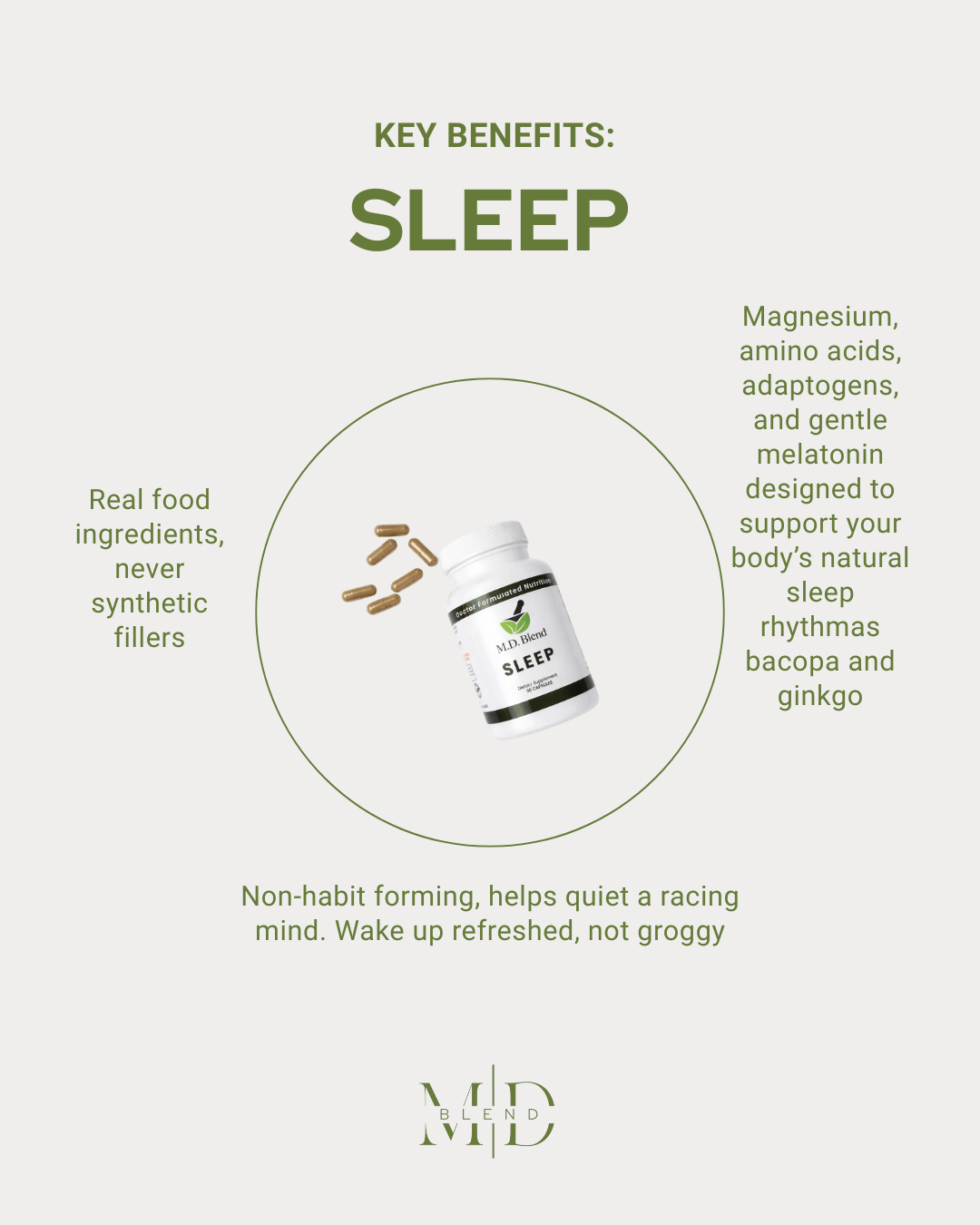 M.D. Blend’s Sleep formula helps you fall asleep naturally without grogginess. Sleep is a thoughtfully formulated blend of magnesium, amino acids, adaptogens, and gentle melatonin designed to support your body’s natural sleep rhythm. This soothing formula encourages relaxation, promotes a balanced mood, and enhances overall nighttime wellness—helping you unwind peacefully and wake up feeling restored and refreshed.