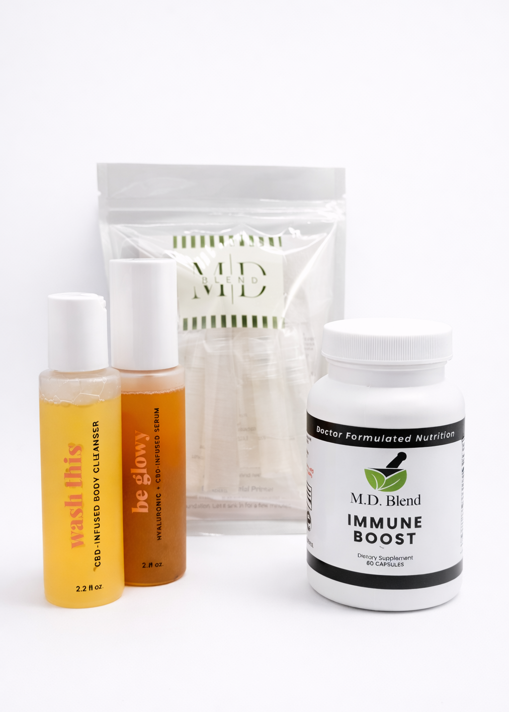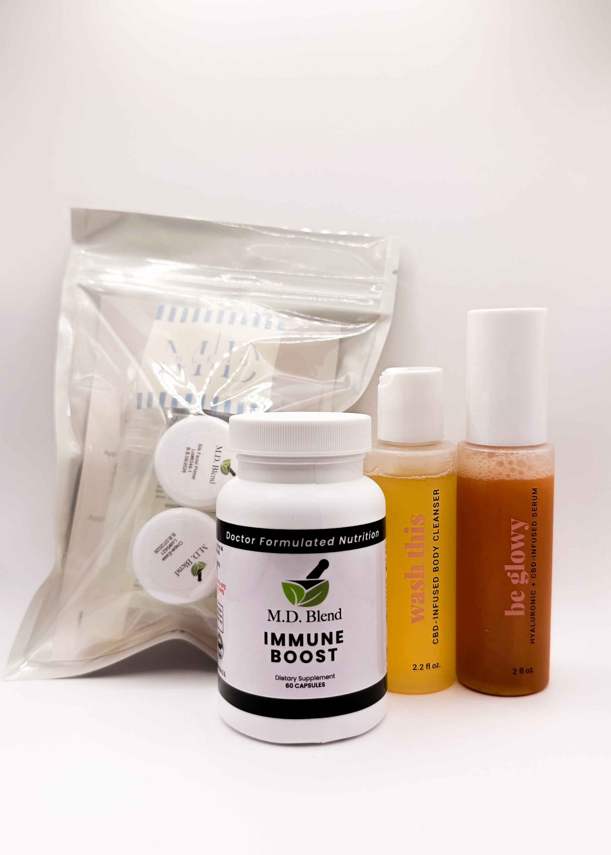 A perfect gift for your loved one who is always on the go : M.D. Blend 8-Piece Skincare Travel Set, Switch2Pure Travel Wash This Body Cleanser, Switch2Pure Be Glowy, and Immune Boost.
