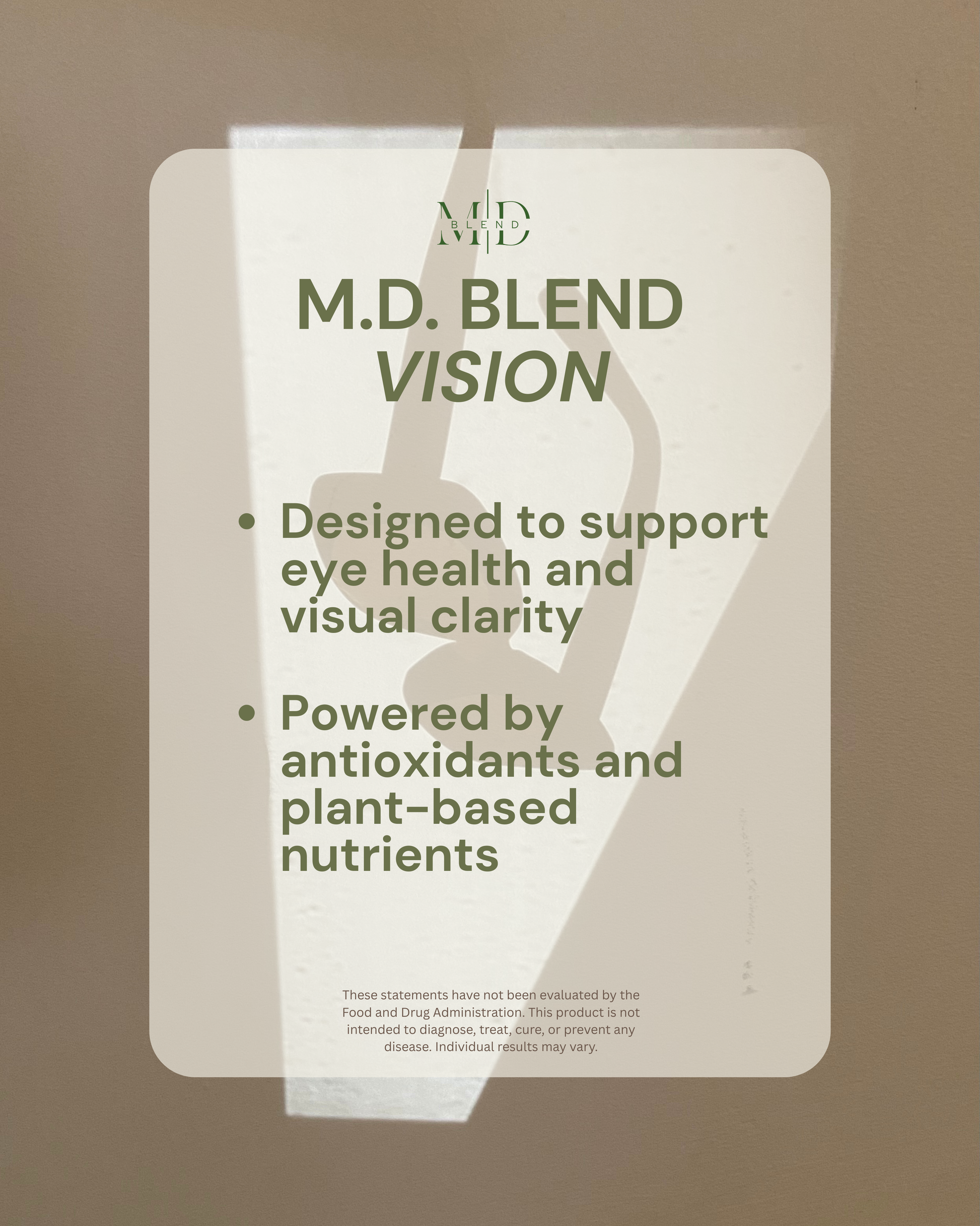 Brief Description: M.D. Blend’s Vision is a doctor-formulated blend of targeted nutrients designed to support eye health and visual clarity as part of your daily wellness routine. Made with a thoughtfully selected combination of antioxidants and plant-based compounds, Vision helps promote healthy vision and protect against everyday visual stress.