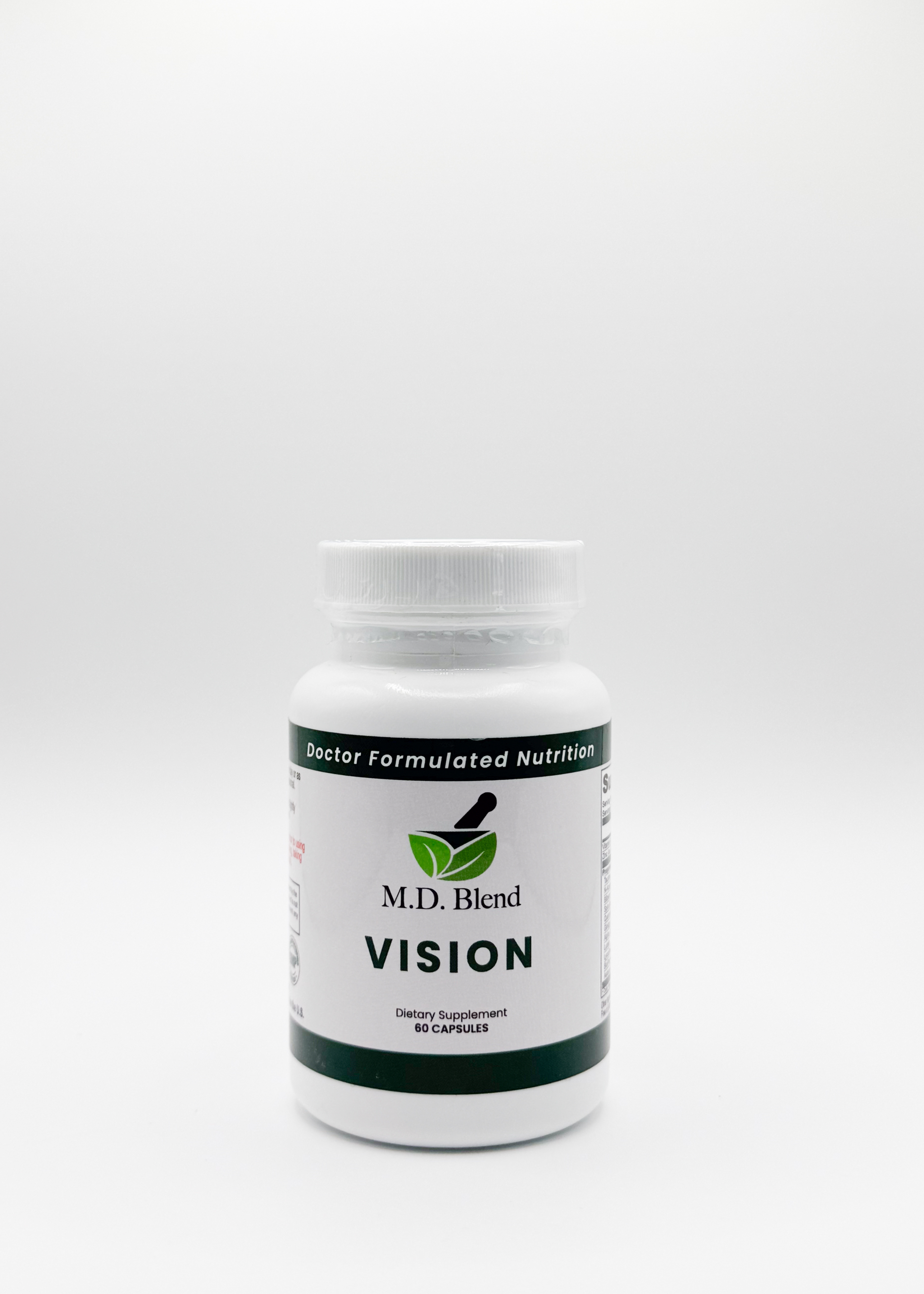 M.D. Blend’s Vision is a doctor-formulated supplement made with a powerful blend of nutrients; including Lutein, Astaxanthin, Alpha Lipoic Acid, Taurine, N-Acetylene-Cysteine (NAC), Lycopene, Bilberry, Ginkgo Biloba, Spirulina, Quercetin, Zinc, and Vitamin A, designed to support eye health and visual clarity as part of your daily wellness routine. This carefully selected combination of antioxidants and plant-based compounds helps promote healthy vision.
